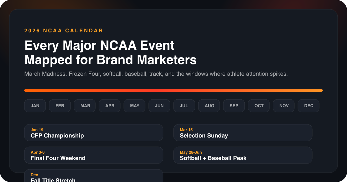 Complete 2026 NCAA events calendar with dates, locations, and broadcast info for every major championship. Includes March Madness, College World Series, Frozen Four, and more. Built for brand marketers planning NIL athlete partnerships.