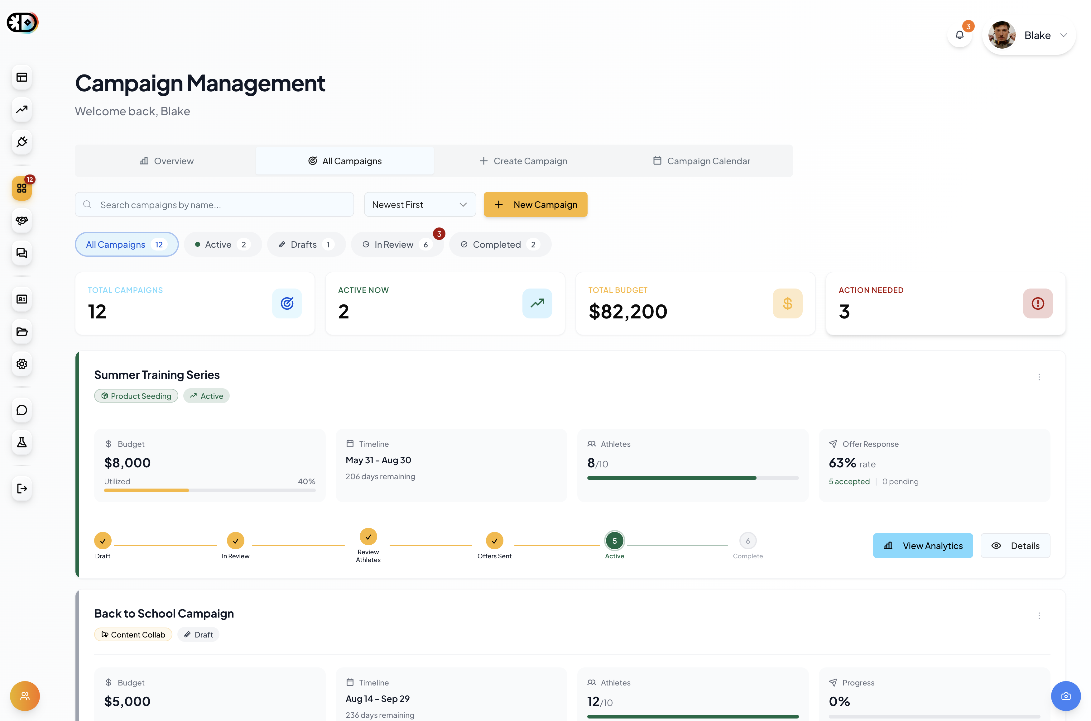 Your partnership command center: track campaigns, manage agreements and payments, message athletes, track deliverables, approve content, and collect every asset in one place — no more toggling between spreadsheets, email, and Venmo.